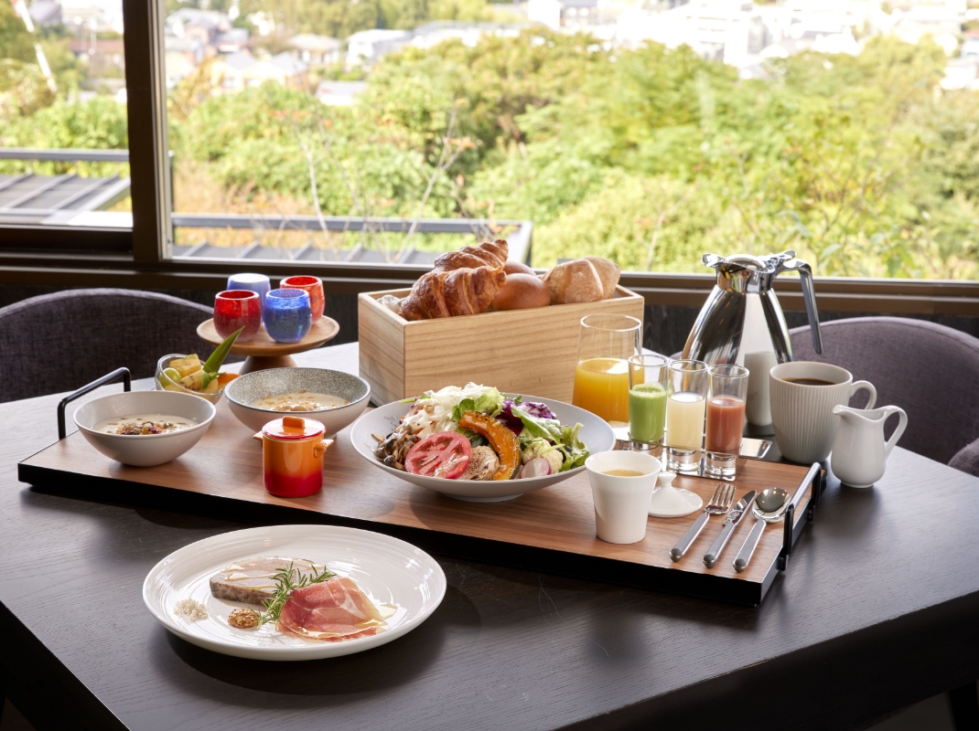15種類の季節の野菜を使用したメランジェサラダ、糸島豚の自家製炭焼きハム、季節の野菜やフレッシュフルーツのスムージーなど、新しい一日のスタートを彩るモーニングセットをご用意。自然と都会が共存するヒルトップリゾートならではの眺望を眺めながら、彩り豊かなお食事を優雅にお楽しみください。