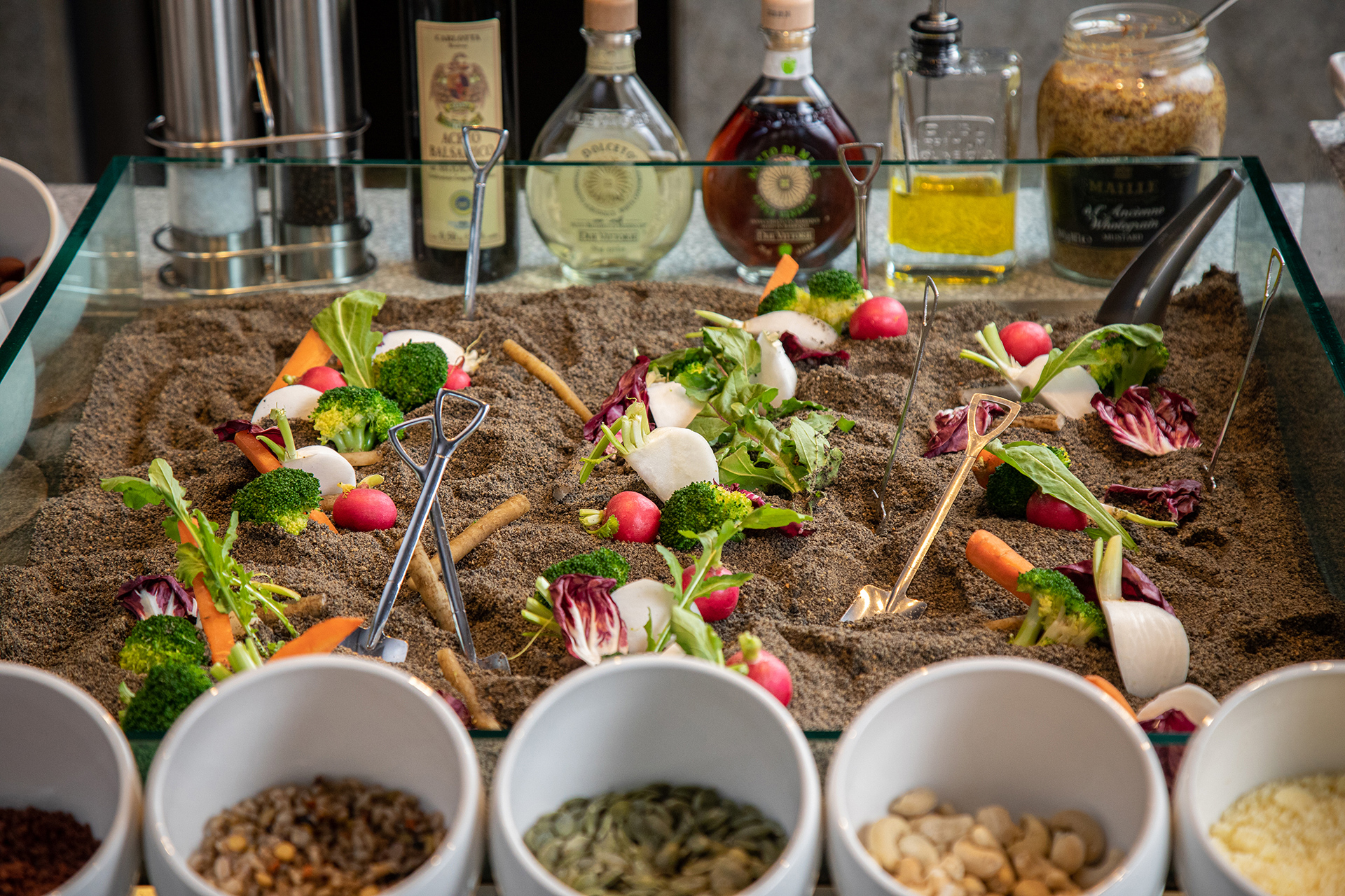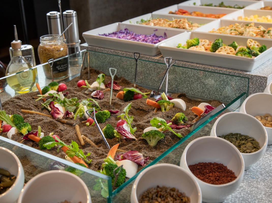 ビュッフェコーナーでは、前菜・温菜・サラダ・菜園風サラダ・自家製フォカッチャなどお好きなだけ。メインには厳選したシェフ自慢の一皿をお選びください。