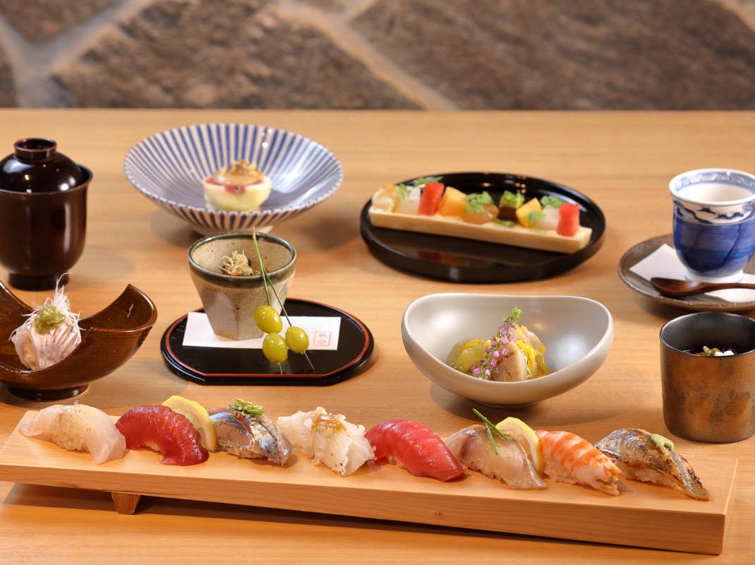 新鮮な海の幸を中心に職人自らが目利きした食材を確かな腕を持つ職人が握る鮨と料理を贅沢に組み合わせた鮨懐石に加え、上質な自然の風合いが感じられる鮨カウンターで目の前で職人が握る鮨と逸品の数々をお任せでお召し上がりいただく贅を尽くしたコースをご用意しております。