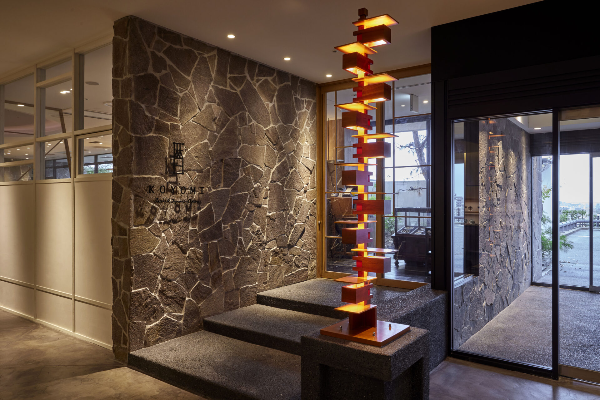 店内で一際目を引く使うごとに味わい深い表情を生み出す上質な風合いの鮨カウンター、それと一体となった釜専用の風炉は左官仕上げにより和の設えでありながらモダンな食空間を演出します。