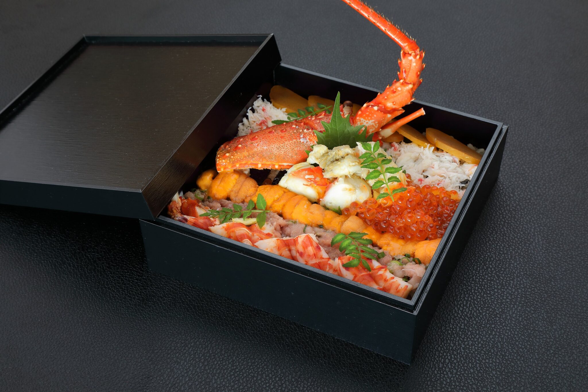 愛媛産の伊勢海老をはじめ熊本産の車海老、ズワイガニやネギトロ、ウニ、いくら、自家製からすみといった7 種類の贅沢食材と有明海産の特上海苔を使用した、見た目にも美しい豪華な逸品です。