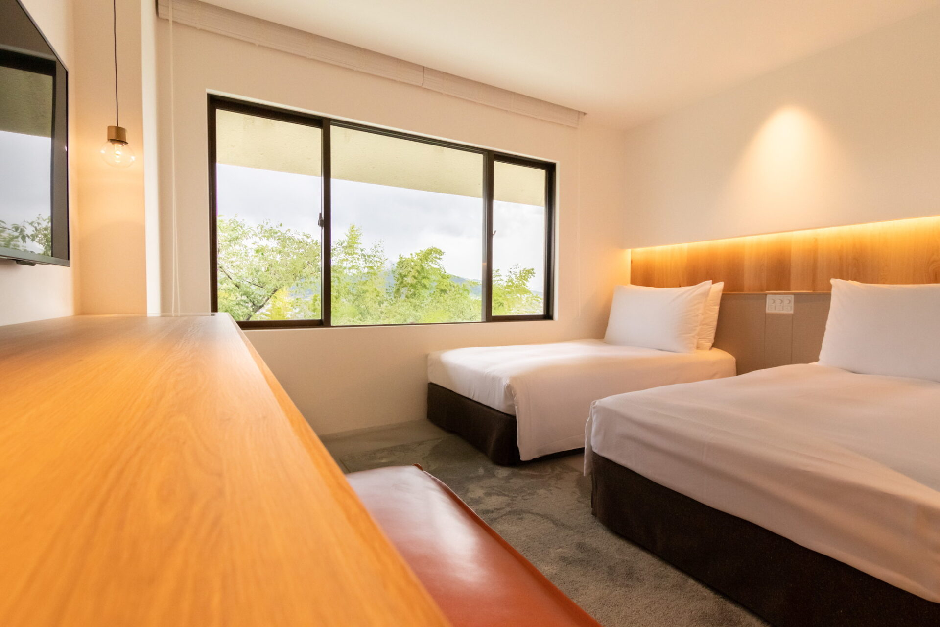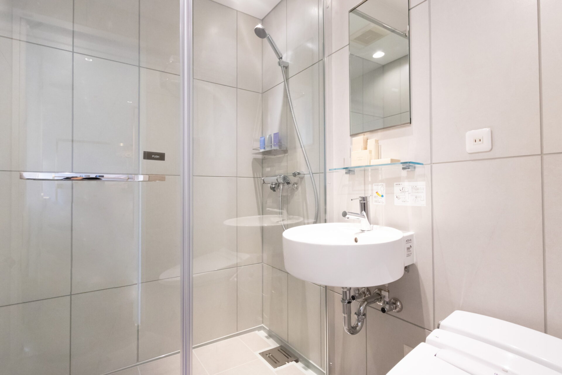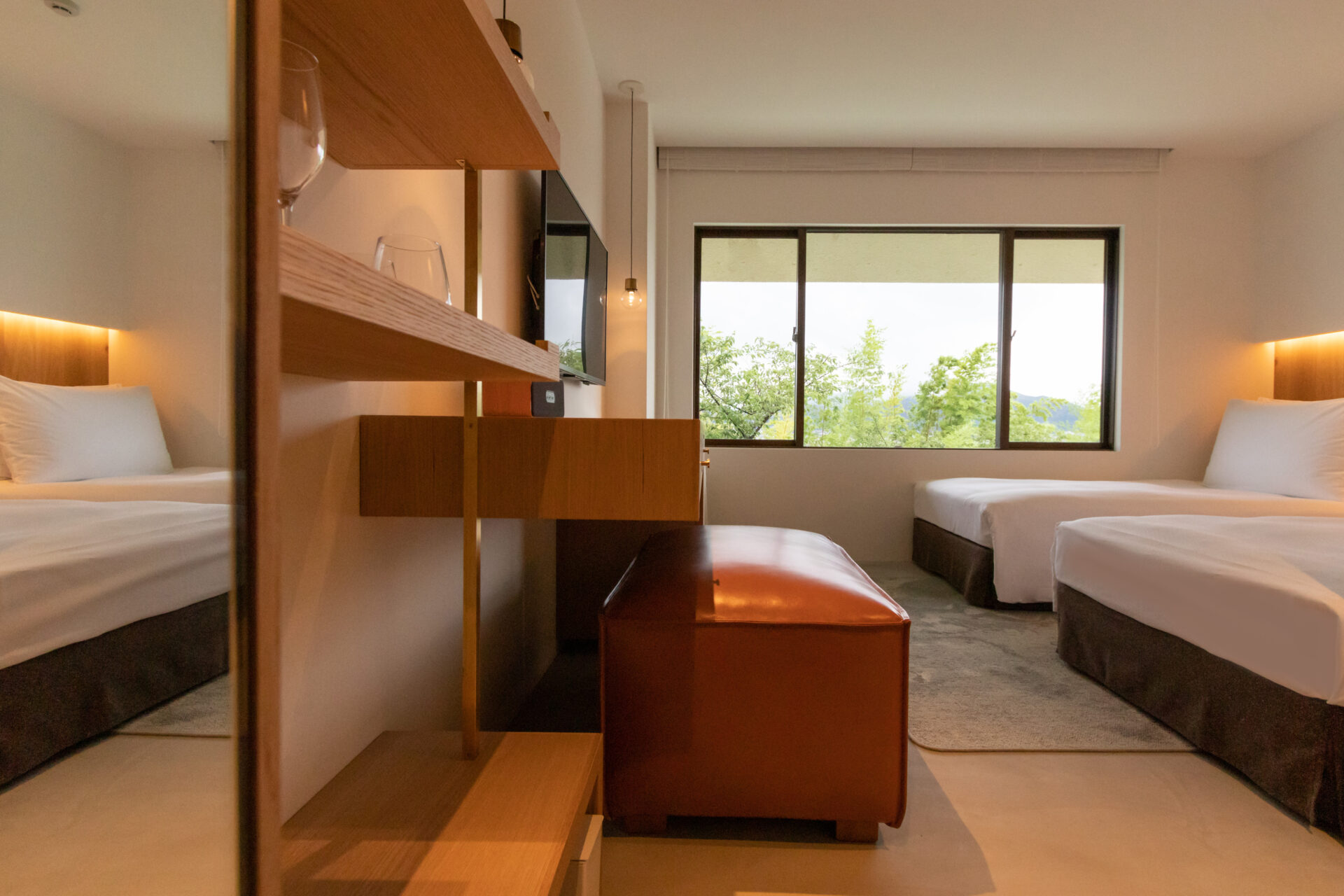 他のAreaFの部屋と比べシンプルな作りの、シャワーブースを設置した客室です。窓からは背振山系や福岡の街並みを望む眺望が広がっています。手挽きのコーヒーミルで香り高いコーヒーをお楽しみいただけます。