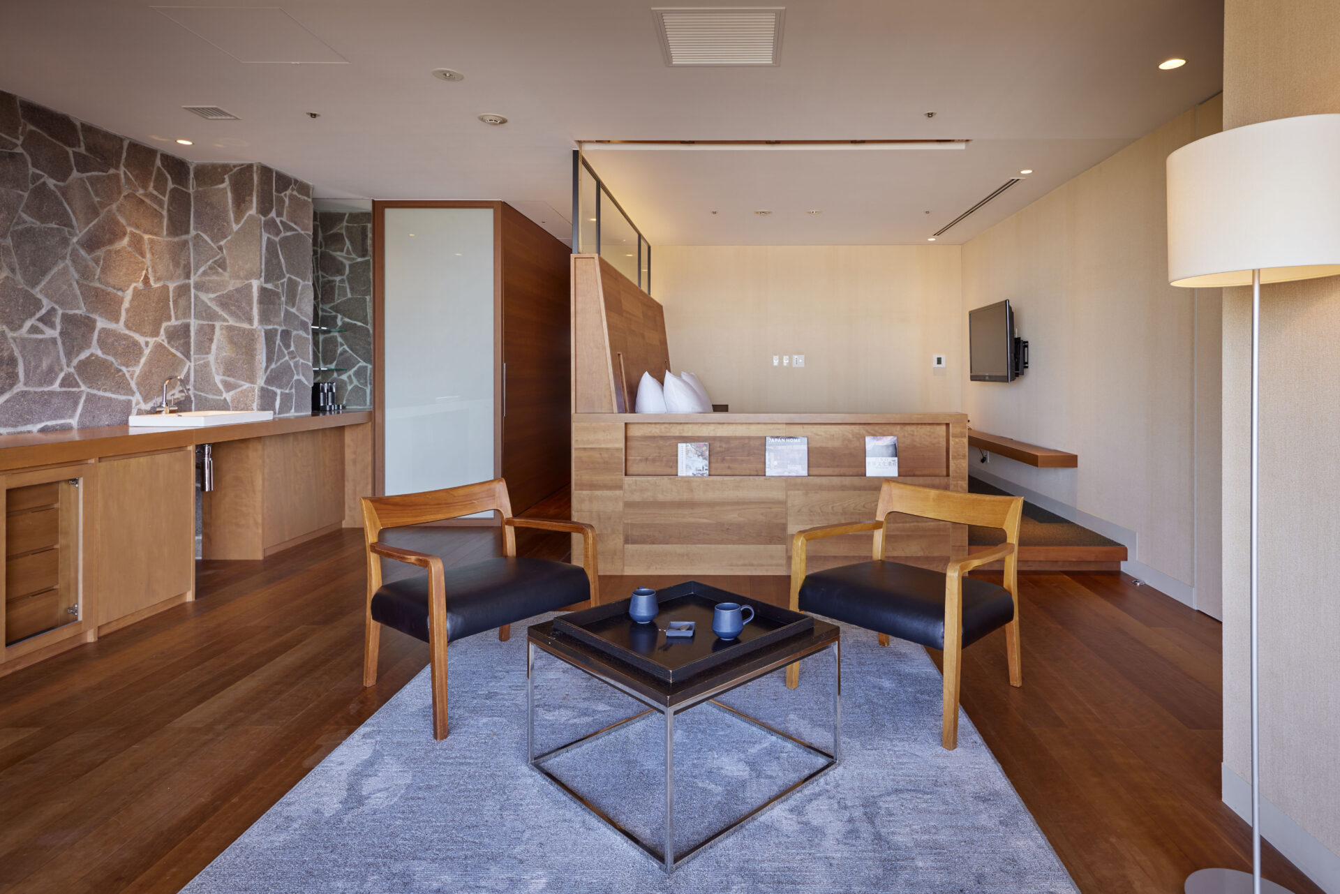 テラスに面した大きなスイーブウィンドウが特徴的な開放感に溢れる客室。室内からでもテラス越しに緑とダイナミックな夜景を堪能できます。客室内でスパトリートメントもご利用いただけます。