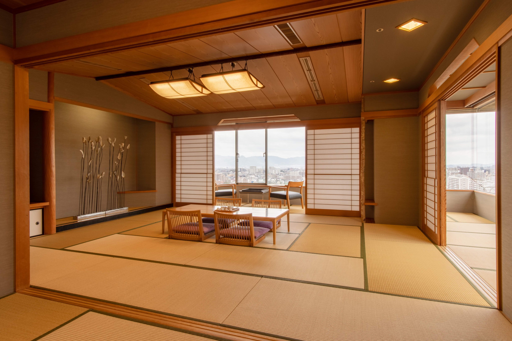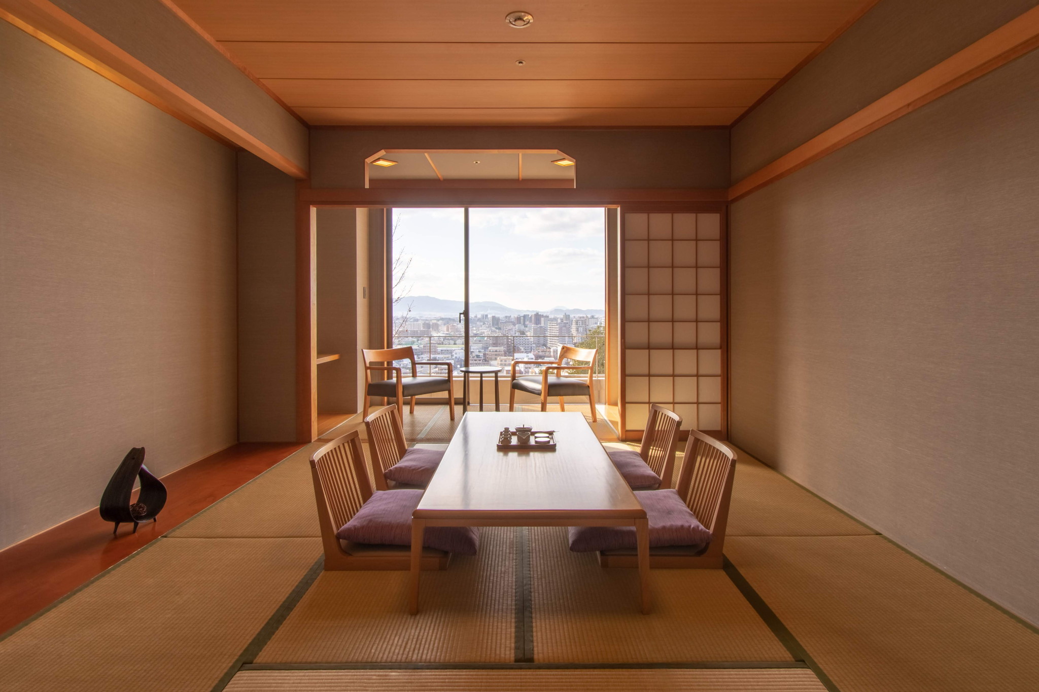 大きな窓とテラスから夕焼けやダイナミックな夜景が楽しめます。グループやご家族連れにおすすめの客室です。
